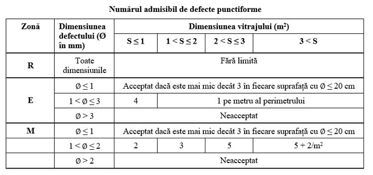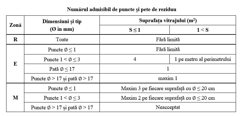 Dacă cel puţin unul dintre criteriile de mai jos este depăşit, geamul cu şpros nu este acceptabil: